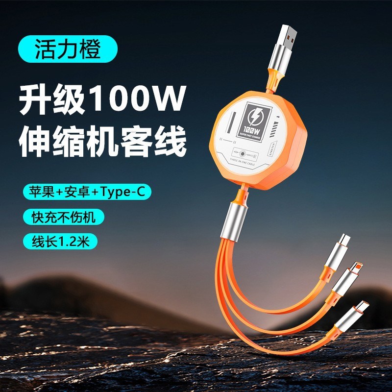100W八方盒伸缩超级快充三合一数据线适用苹果华T为安卓手机充电