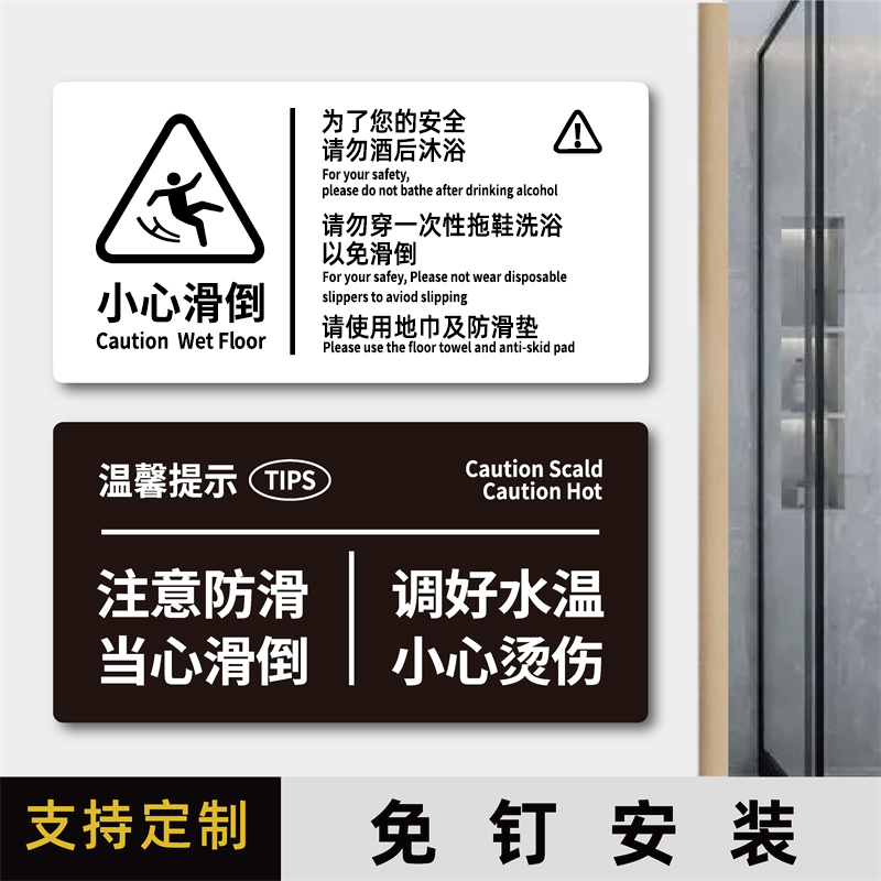 酒店宾馆民宿房间指示牌卫生间小心地滑标识贴酒后沐浴请勿使用一次性