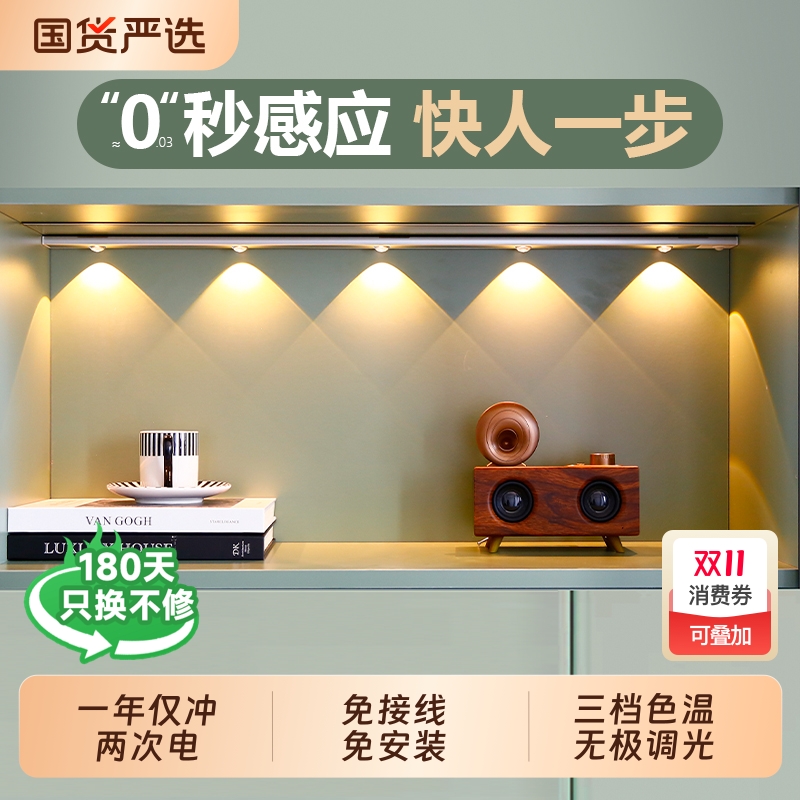 led充电橱柜灯灯带无线磁吸免接线衣柜酒柜鞋柜超薄家用人体感应