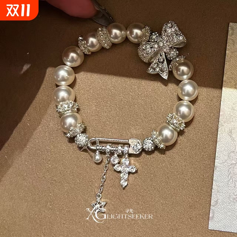 法式珍珠满钻蝴蝶结串珠手链别针流苏千金感甜美气质重工爆闪手饰