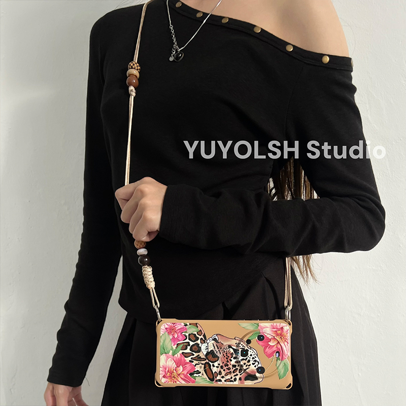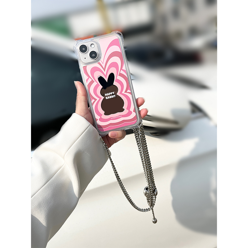 ins风粉色影子兔子镜面补妆金属可调节链条斜挎四角开孔14Pro