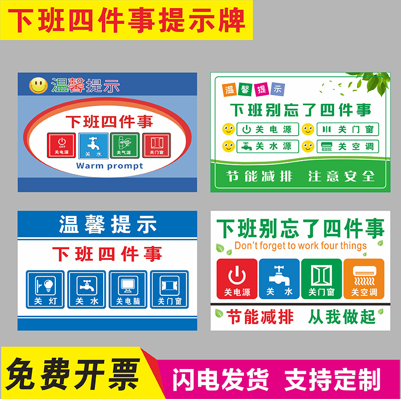 工厂下班四件事温馨提示节约水电及时关灯节约用水下单打卡定制标识牌