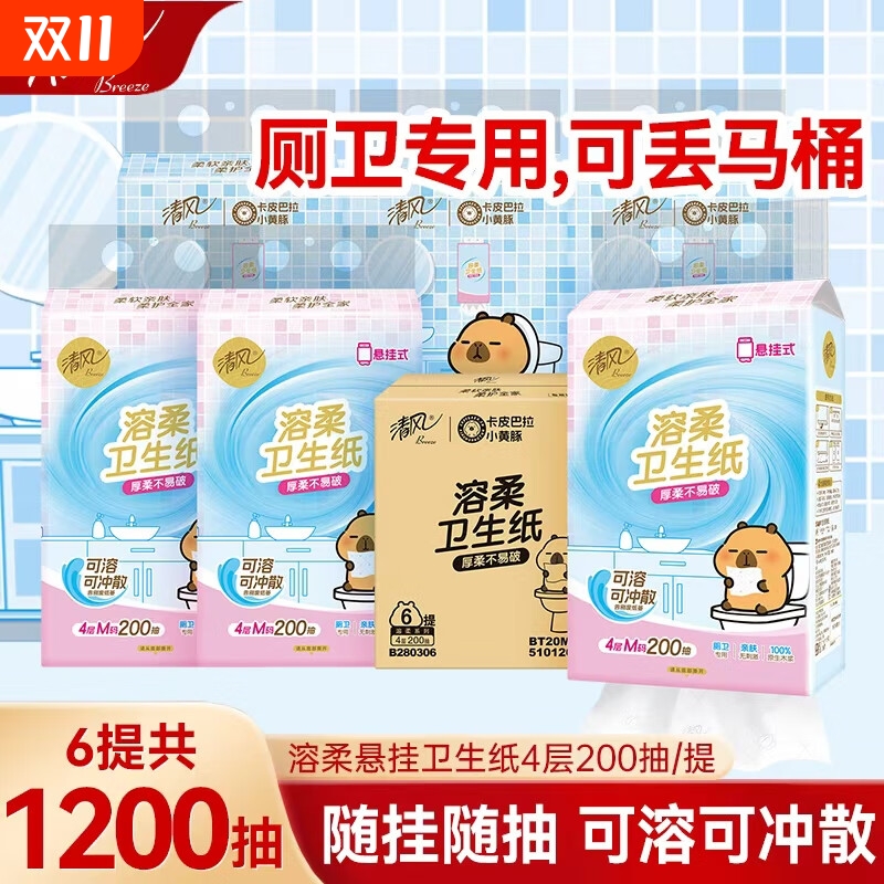 清风溶柔挂抽200抽6提悬挂式抽纸大包餐巾纸厕纸可冲散4层不易破