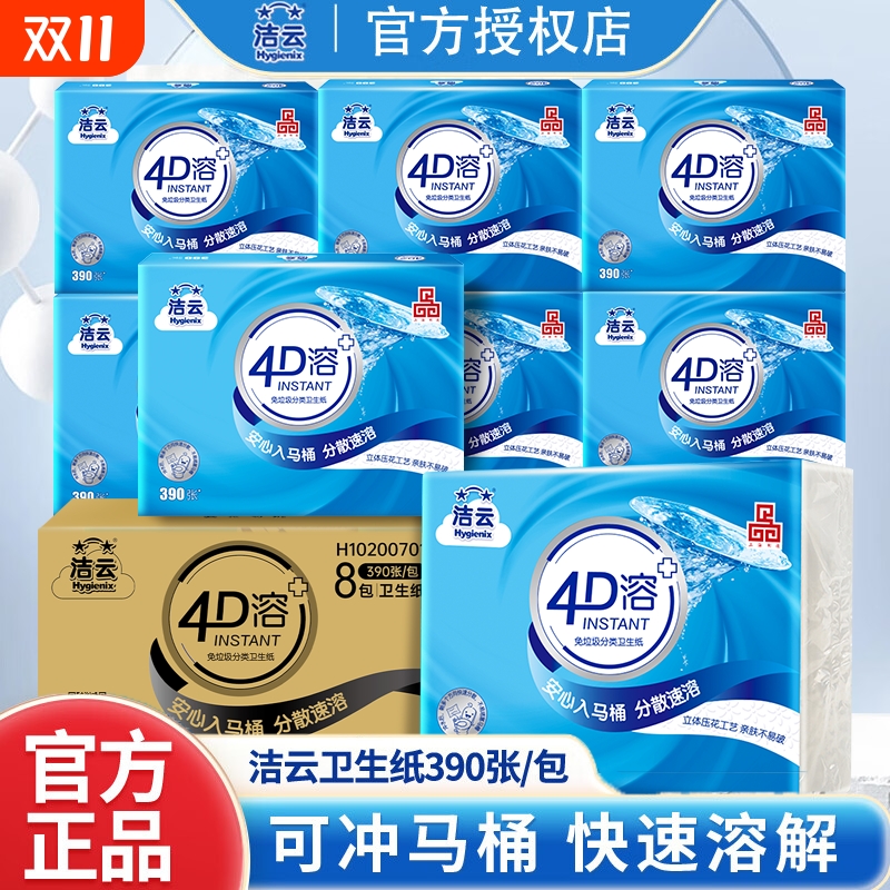 洁云4D溶方包卫生纸390张整箱家用平板纸实惠装厕纸可溶草纸压花