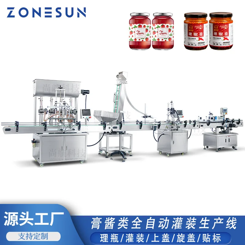 ZONESUN 全自动气动膏体玻璃圆瓶灌装旋盖贴标老干妈番茄酱包