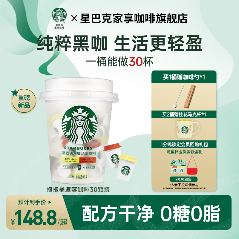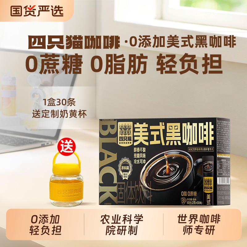 四只猫00美式黑咖啡提神速溶纯黑咖啡30条/盒送奶黄杯特浓拿铁