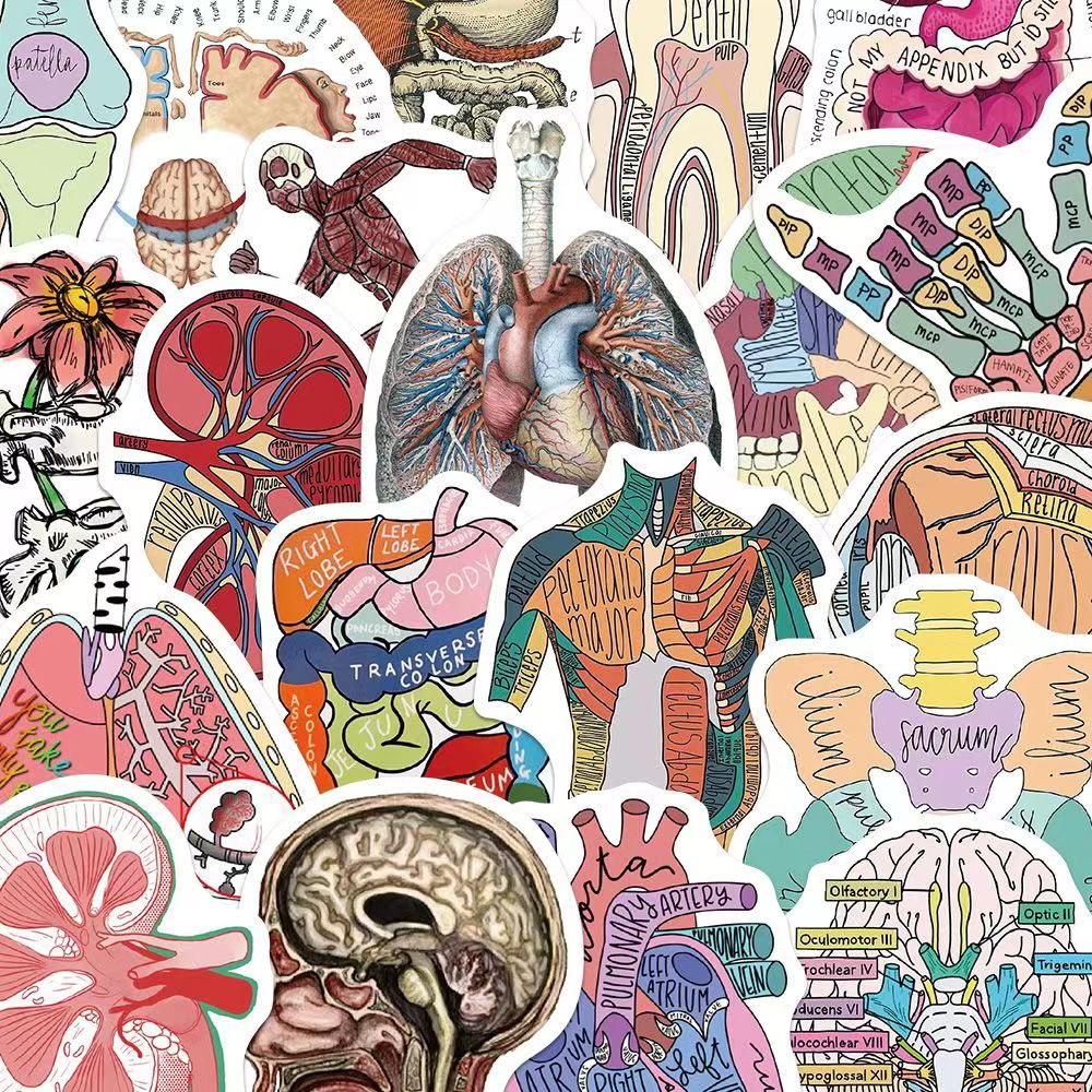 50张解剖学英文贴纸人体器官构造医学手账桌面笔记本装饰防水贴画