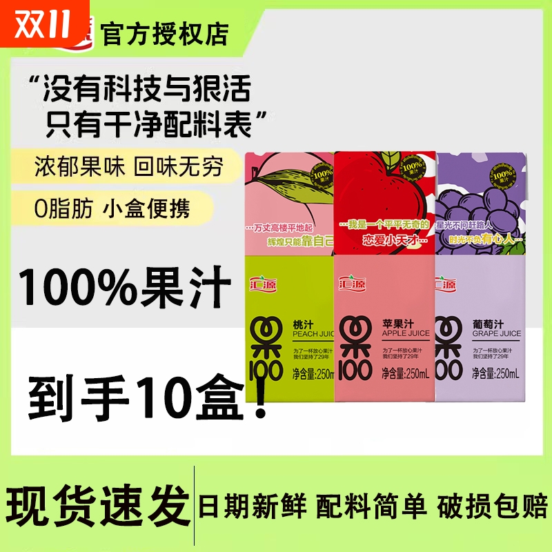 【新品上市】汇源100%果汁250ml*10盒多口味清爽解腻浓缩