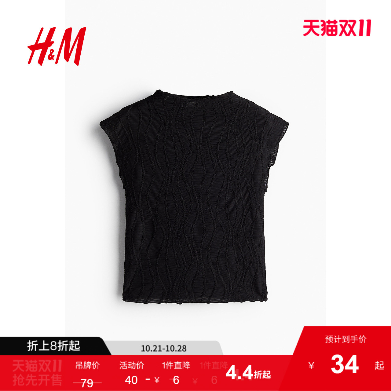 HM女装T恤秋季短袖常规款修身提花汗布小高领上衣1244947