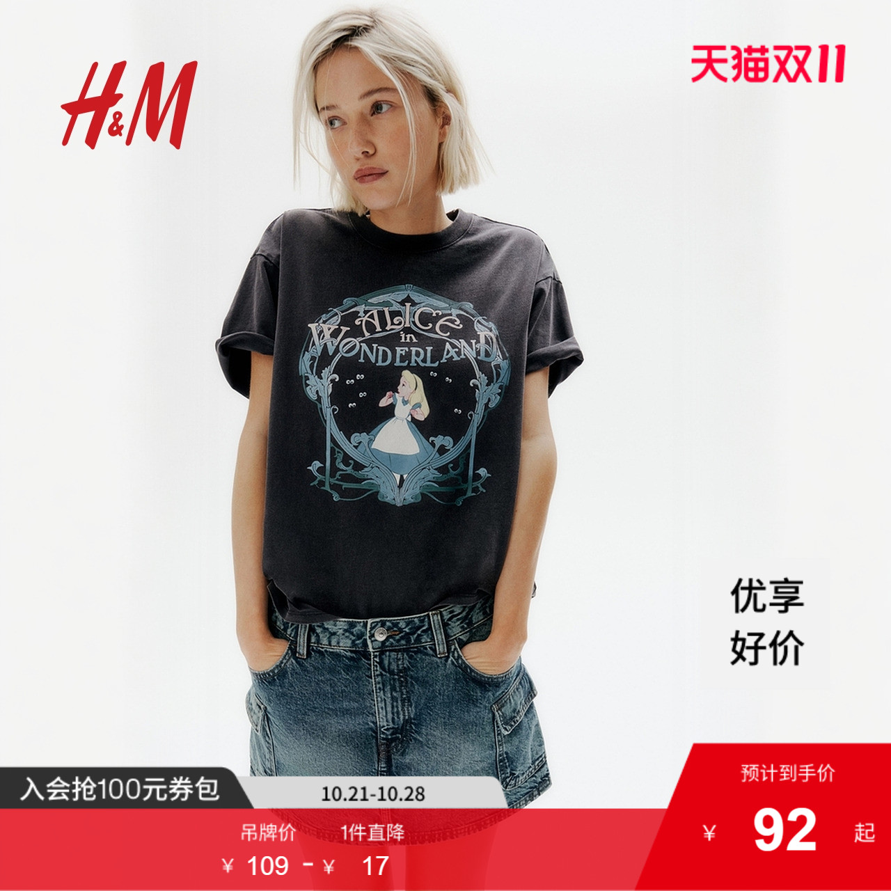 【博主推荐】HM女装T恤爱丽丝美式圆领大廓形印花短袖上衣1260