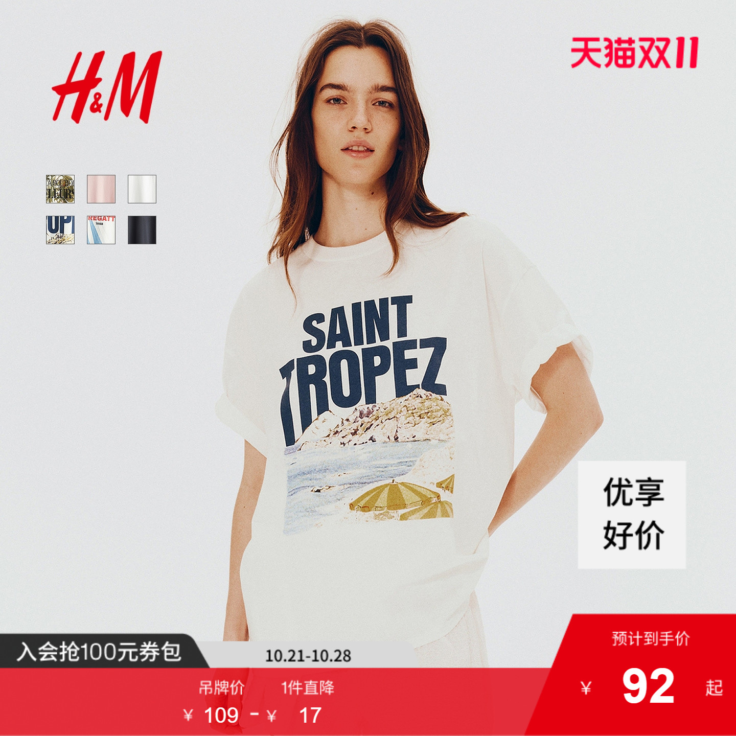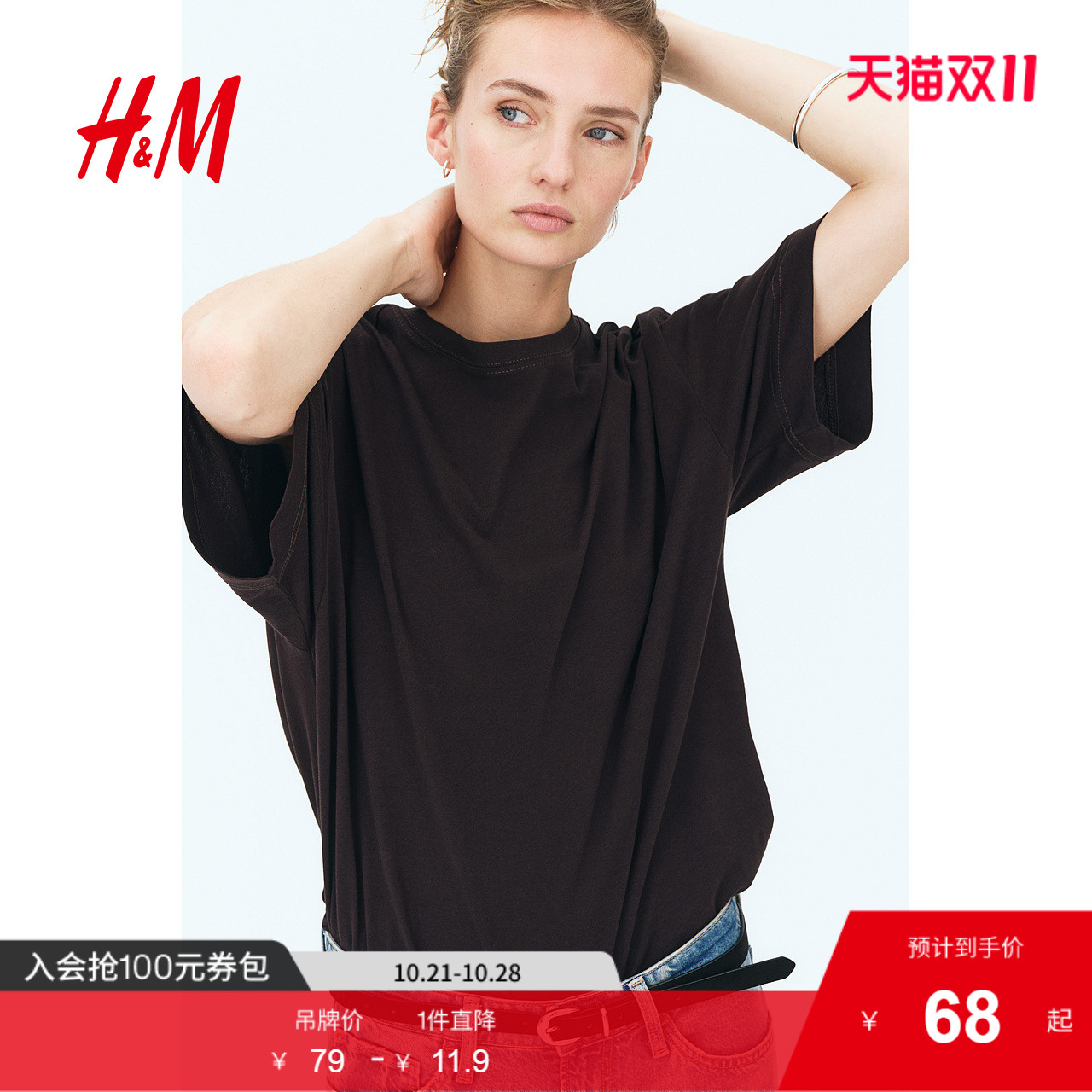 HM女装T恤秋季休闲直筒舒适大廓形落肩短袖上衣1246290