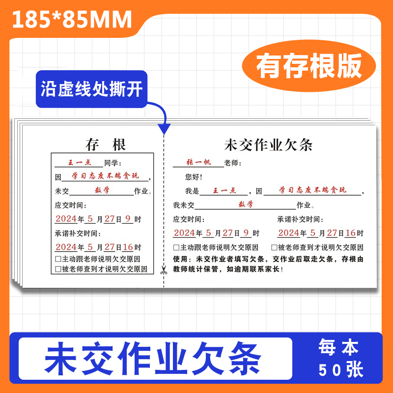 未交作业欠条存根版小学生初中生班级管理各科作业未完成未上交提醒帮