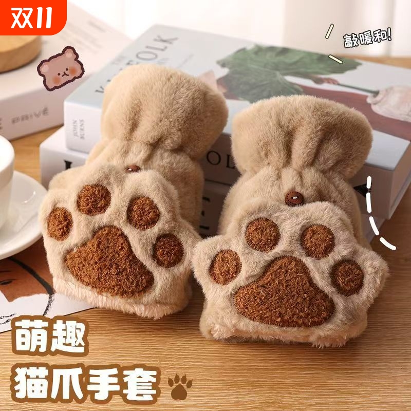 可爱熊掌翻盖手套女冬季毛茸茸露指加绒加厚半指猫爪学生防寒保暖