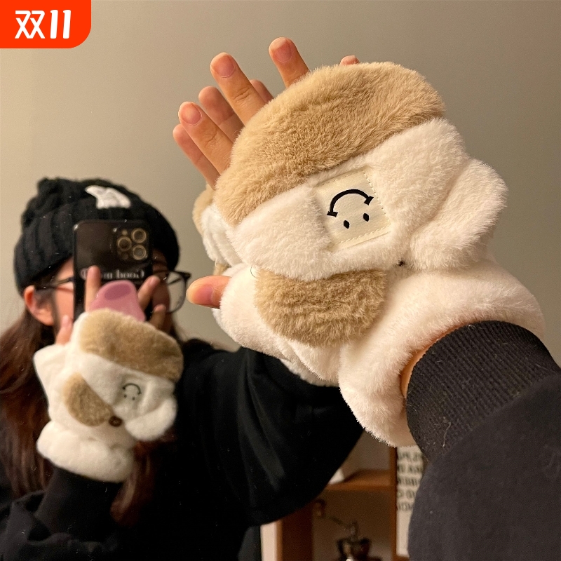 手套女冬季可爱毛绒保暖学生加绒加厚半掌露指毛茸茸搞怪翻盖小熊