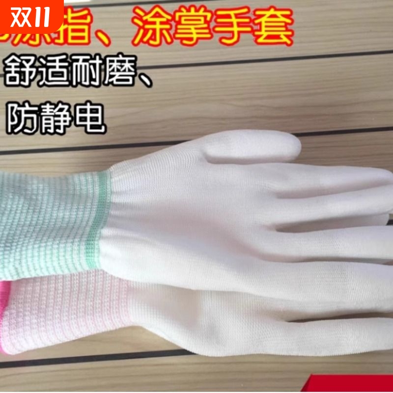 PU涂掌薄款白色尼龙手套涂胶浸胶涂指电子无尘防静电劳保耐磨作业