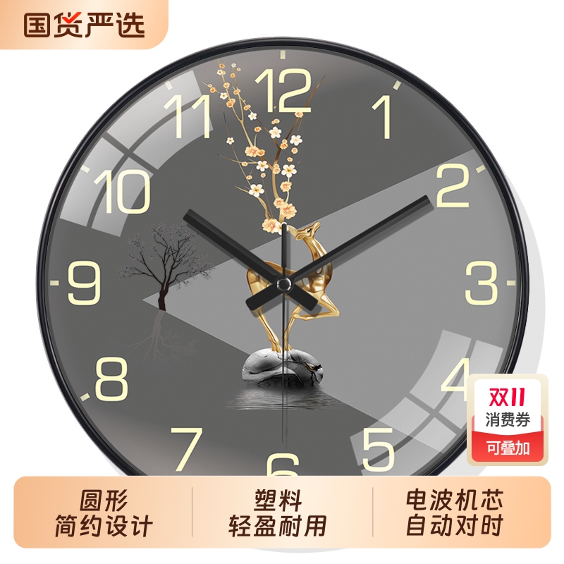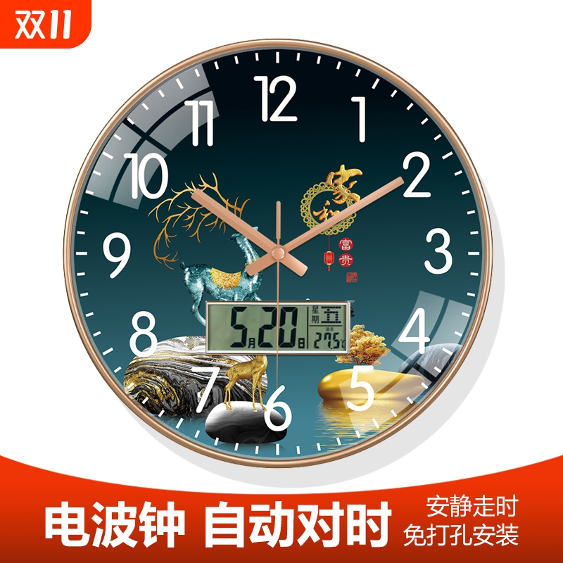 现代麋鹿时钟挂钟钟表挂墙自动对时轻奢客厅电波家用免打孔挂表