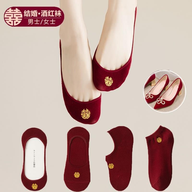 酒红袜子新郎新娘男女一对结婚情侣隐形喜庆深暗红色船袜新婚中筒
