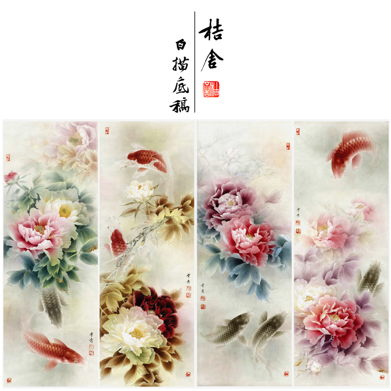 【四条屏】龚雪青工笔画白描底稿《富贵有余》鲤鱼花鸟线稿XQ71