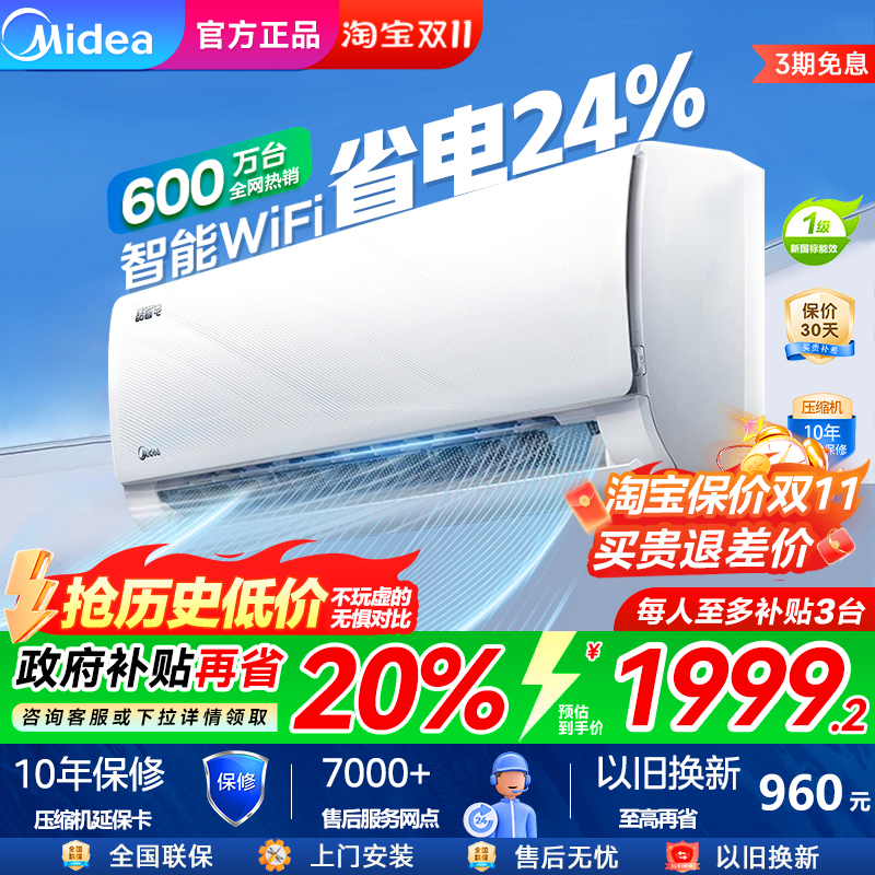 【菜鸟次日达】美的空调无风感1匹1.5匹pro壁挂式变频一级能效