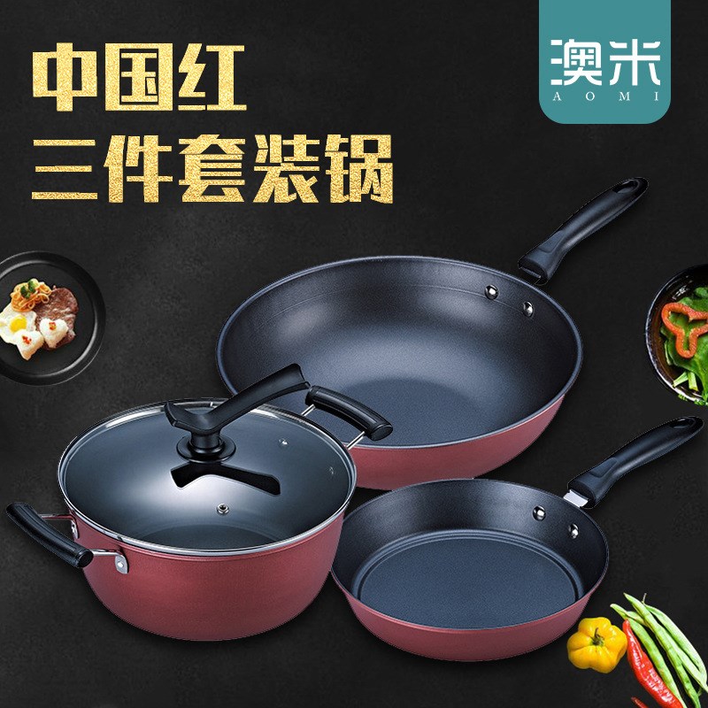 中国红三件套锅 炫彩不粘锅礼品套装汤锅炒锅平底锅厨房多用能锅