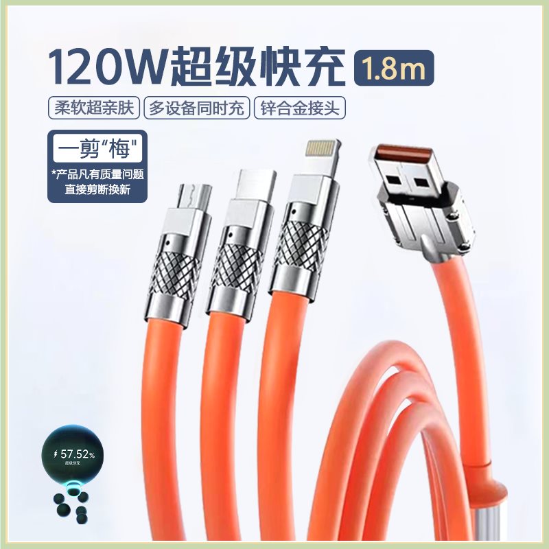 现货【一拖三】6A快充机客线支持120W充电液态硅胶锌合金属头不