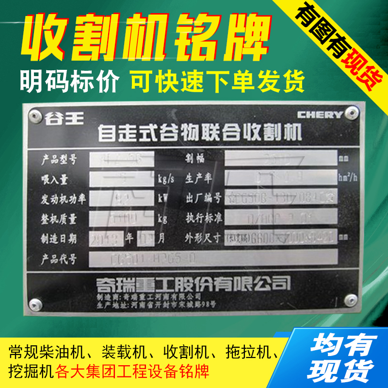 收割机铭牌液压挖掘机旋挖钻机名牌推土压路起重机铭牌常规有现货