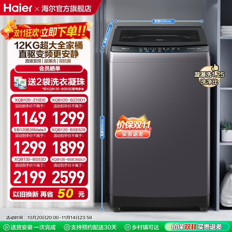 洗衣机以旧换新补贴海尔波轮全自动家用12kg超大容量除菌20D1