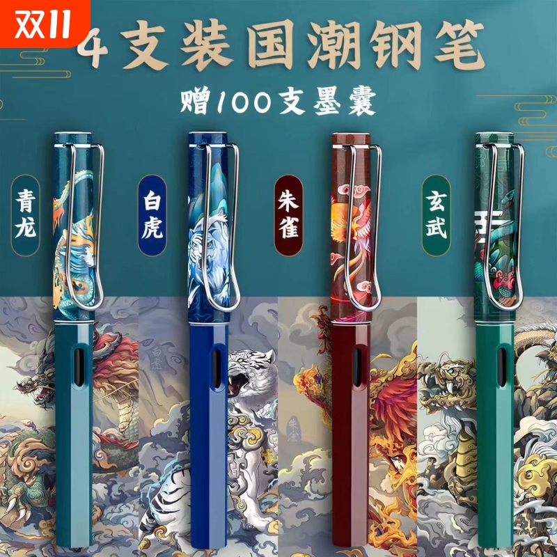 国潮四神兽盒装速干刷题笔青龙白虎玄武朱雀图案高颜值按动碳素笔