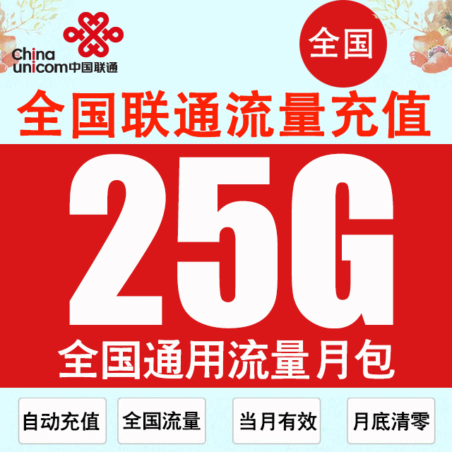 中国联通流量充值25GB全国3g4g5g通用流量包加油包月包自动