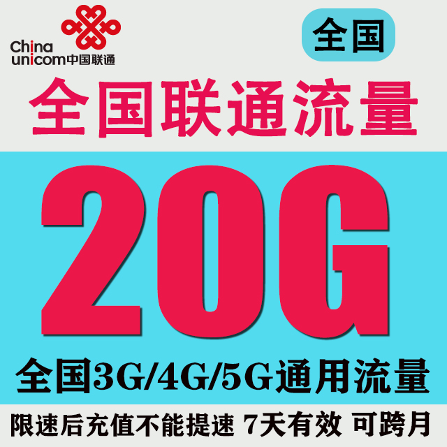 安徽联通流量充值20GB全国3g4g5g通用流量包加油包7天包自