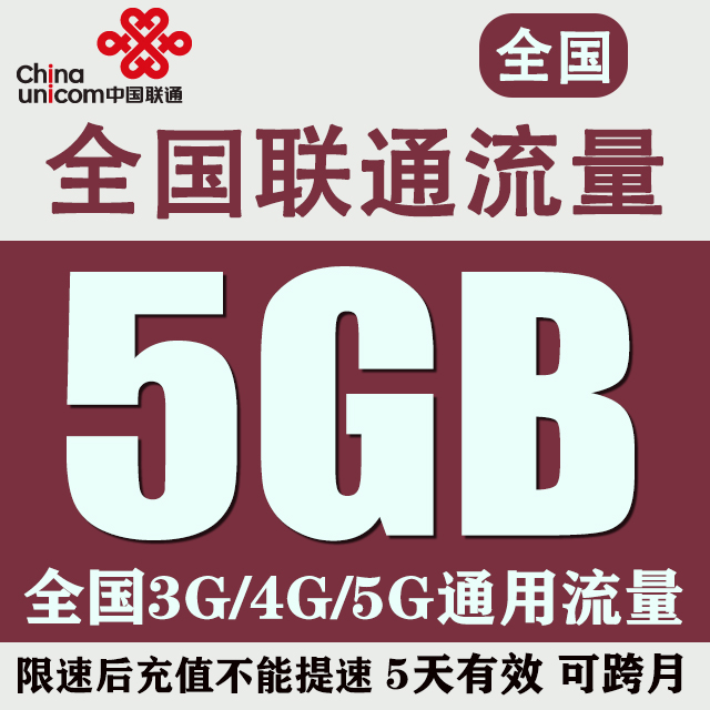 全国联通流量充值5GB全国流量3g4g5g通用流量包5天有效不可