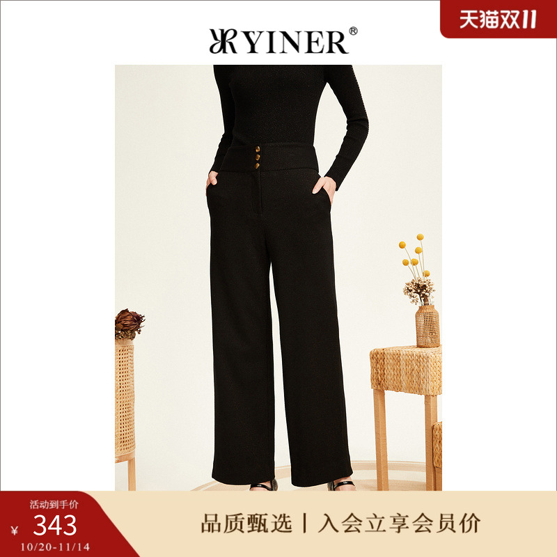 YINER音儿女装冬季羊毛黑色长裤高腰直腿直筒休闲裤