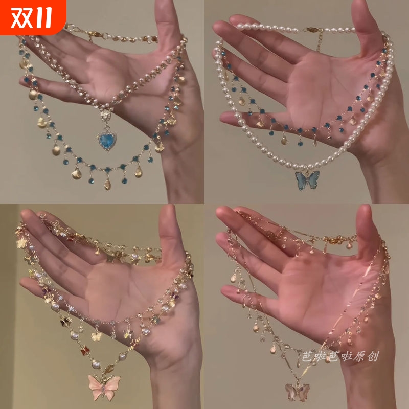 「微沉」贝壳锆石流苏项链叠戴高级感毛衣链复古锁骨链蝴蝶新款