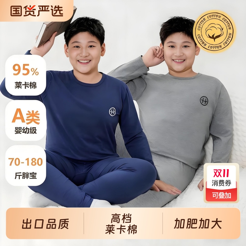 日系男胖童秋衣秋裤内衣套装A类莱卡棉宽松秋冬保暖肥胖男士加大
