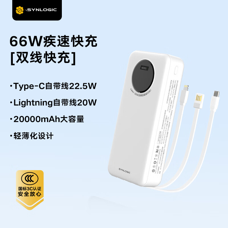 【有3C更安全】闪能20000毫安c超快充兼容66W自带线双向移