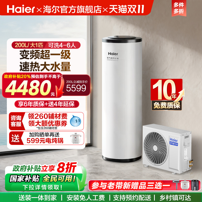 海尔空气能热水器200L家用超一级能效全变频大1匹空气源热泵A2