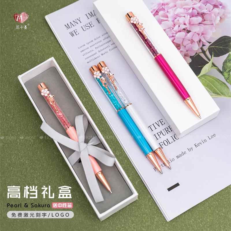 珍珠花笔夹水晶圆珠笔少女中性顺滑签字笔高颜值送同学教师礼刻字