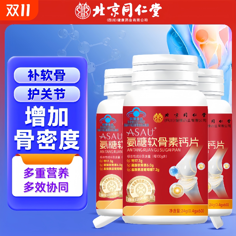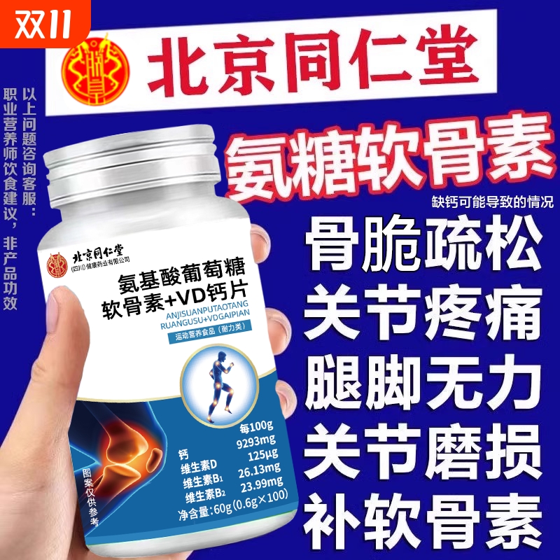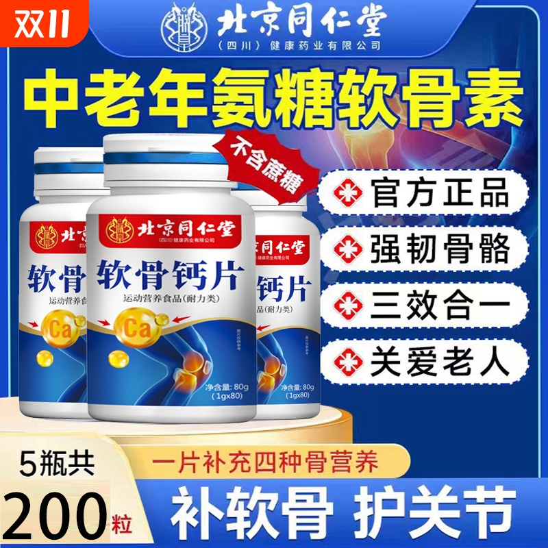北京同仁堂软骨钙片缺钙中老年人抽筋腰腿无力护膝痛80粒补钙氨糖