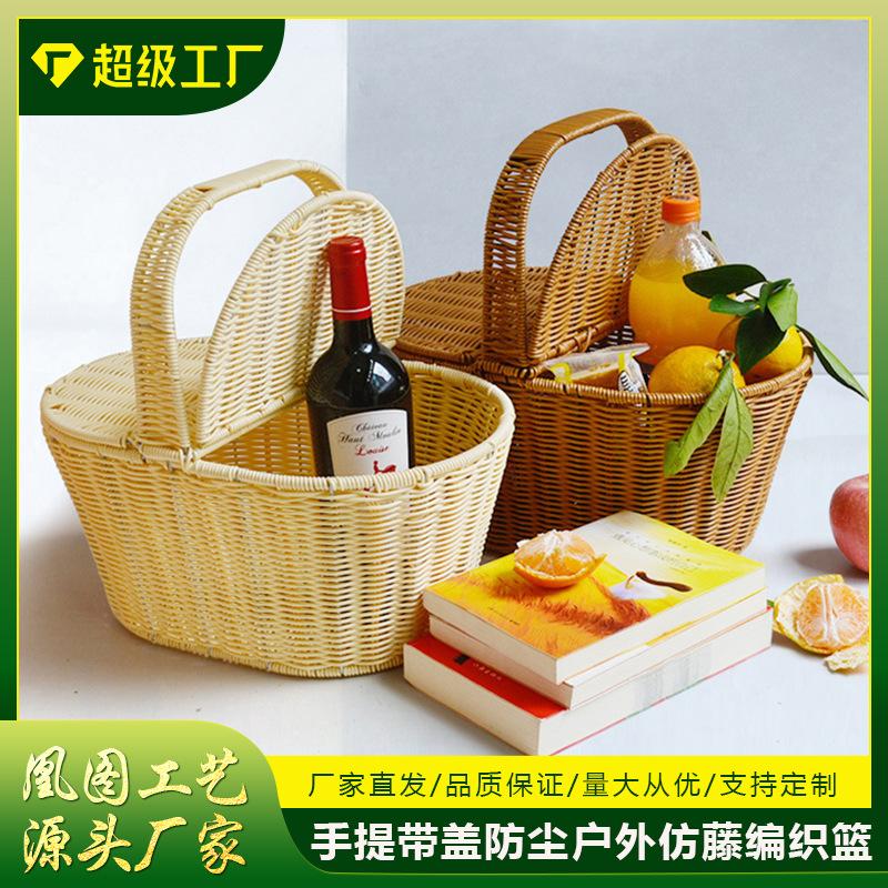 手工编织收纳手提藤编带盖篮蔬果采摘篮酒店清洁手提篮户外野餐篮