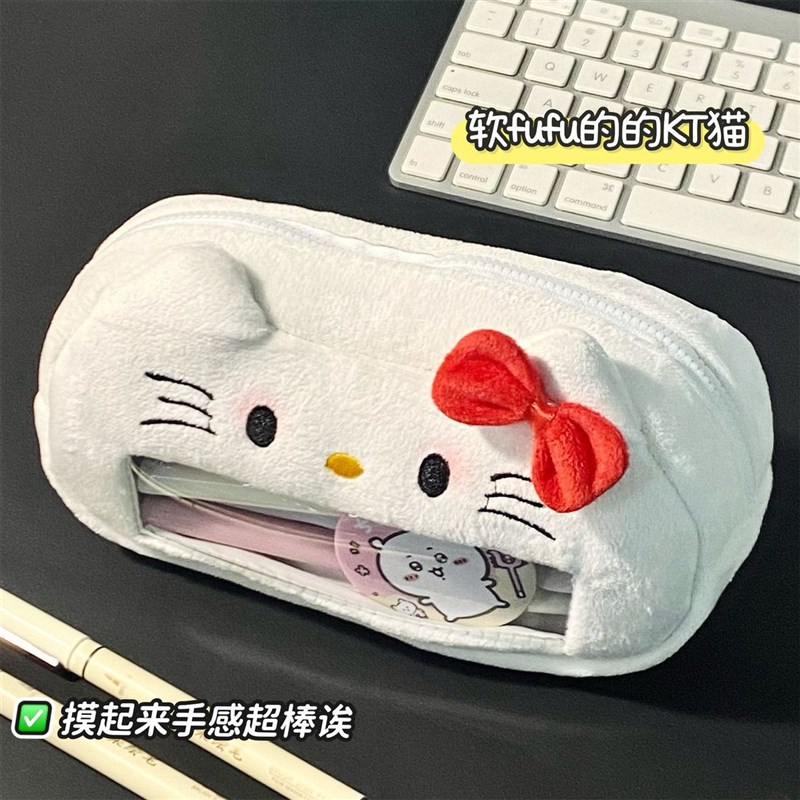 速发猫毛绒绒可视窗笔袋可爱孩蝴蝶结手包学生文具收纳袋