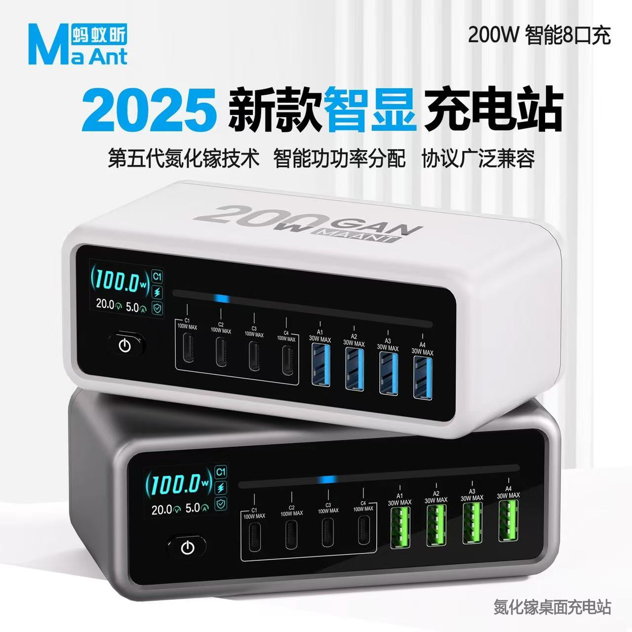 蚂蚁昕2025新款智显桌面充电站200W智能8口触感第五代氮化镓