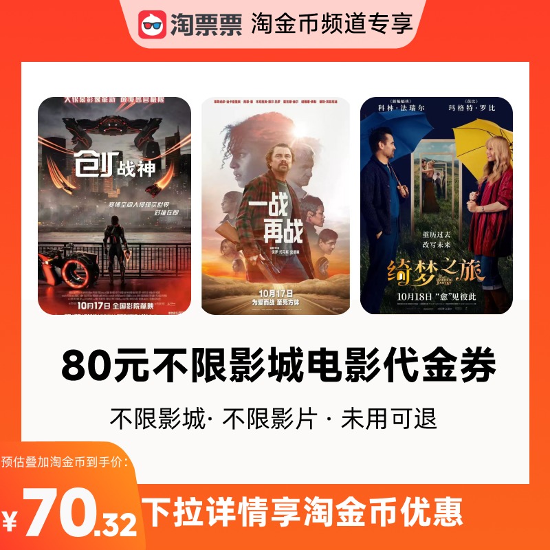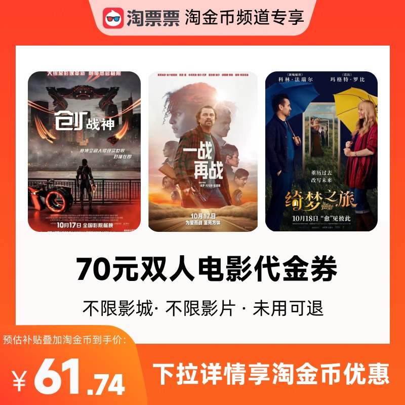 【详情领取淘金币优惠】淘票票70元双人票代金券不限影城不限影片