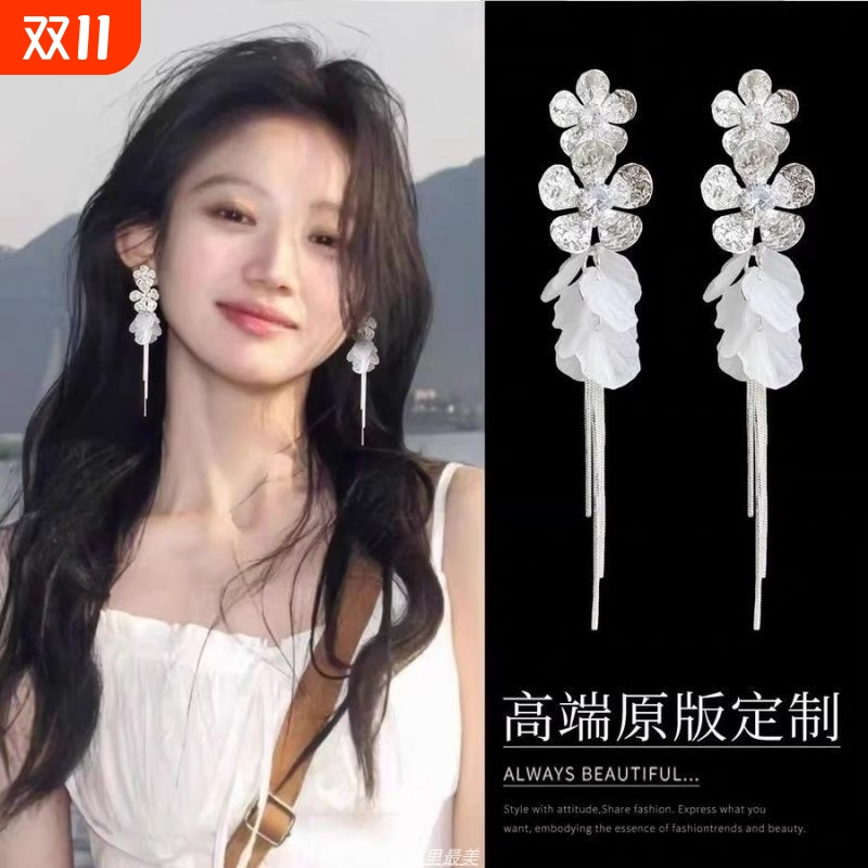 锆石花朵贝壳海边度假风流苏长款耳环女方圆脸耳饰2025新款高级感