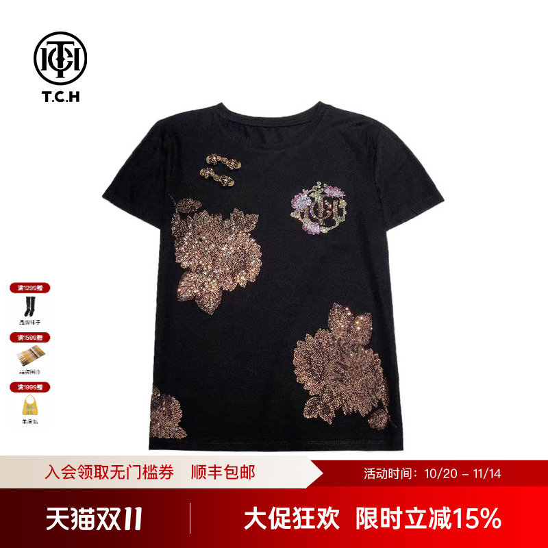 TCH轻者烫钻重工新中式休闲时尚短袖T恤女夏季T72B10E90