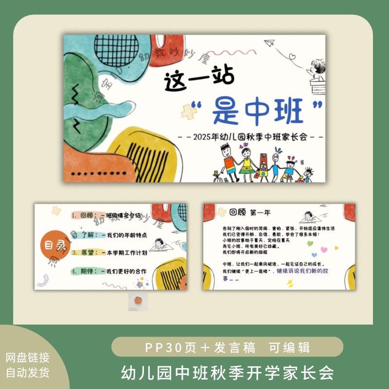 幼儿园中班秋季开学家长会《这一站是中班》ppt+发言稿