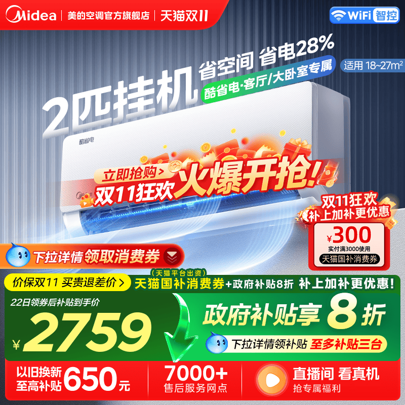 美的官方空调壁挂式2匹一级变频挂机冷暖家用大风量大挂酷省电