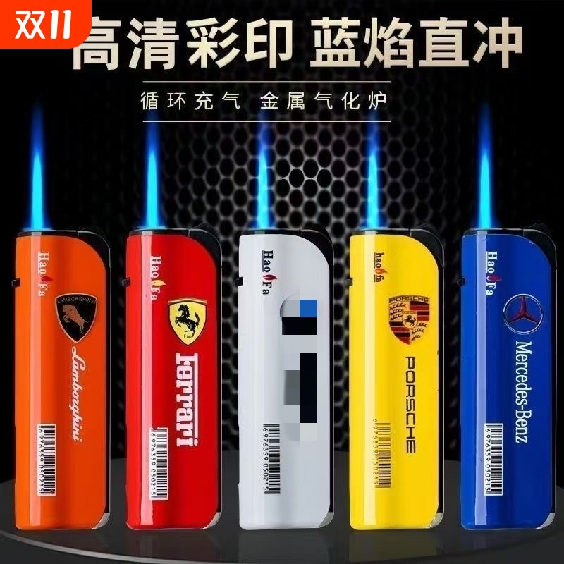 蓝焰直冲防风创意车标一次性可充气打火机耐用防爆批发火机金属