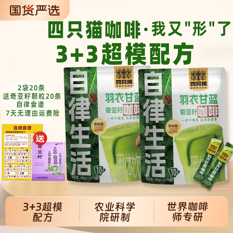 四只猫羽衣甘蓝奇亚籽咖啡膳食纤维代餐奶昔饱腹速溶拿铁抹茶食欲