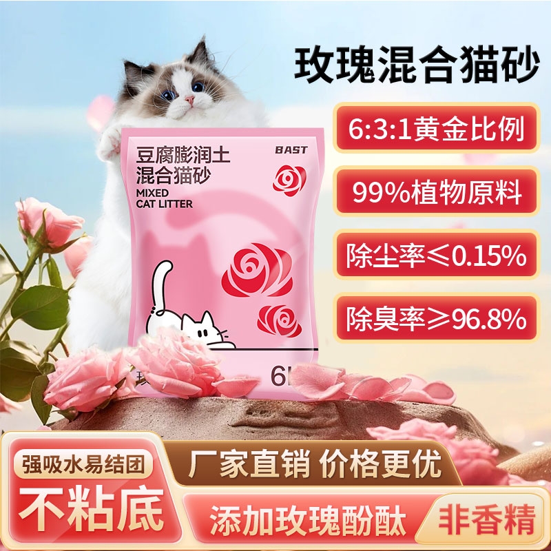 玫瑰香型混合猫砂除臭无尘可冲厕所膨润土豆腐砂秒结团不粘底猫沙