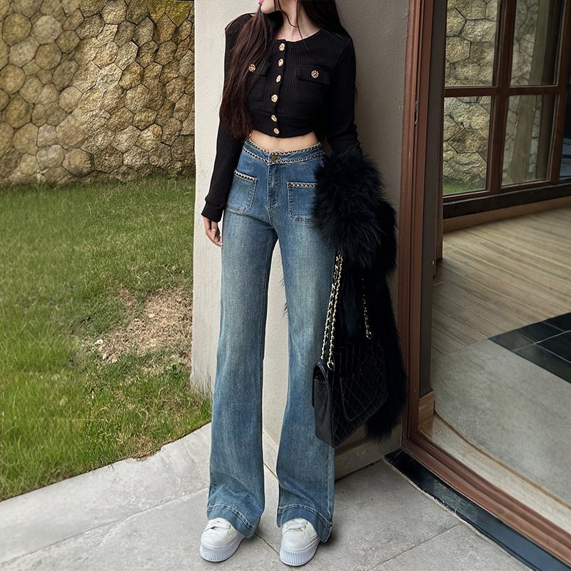 李李服饰小香链条弹力直筒牛仔裤女2025年秋季新款高腰显瘦拖地裤